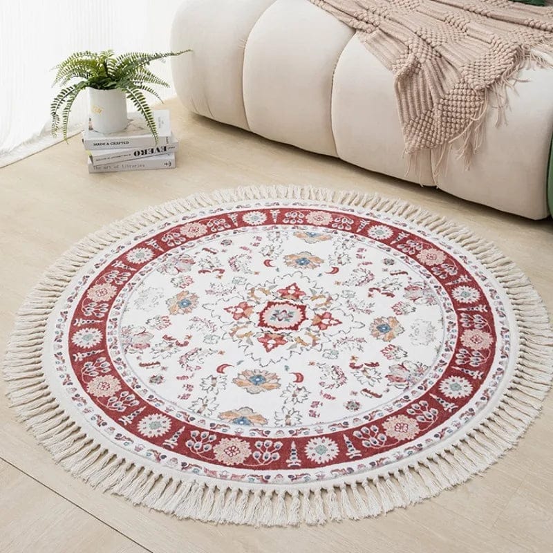 Invitez le charme vintage à votre sol avec notre tapis rond unique aux accents rouges.
